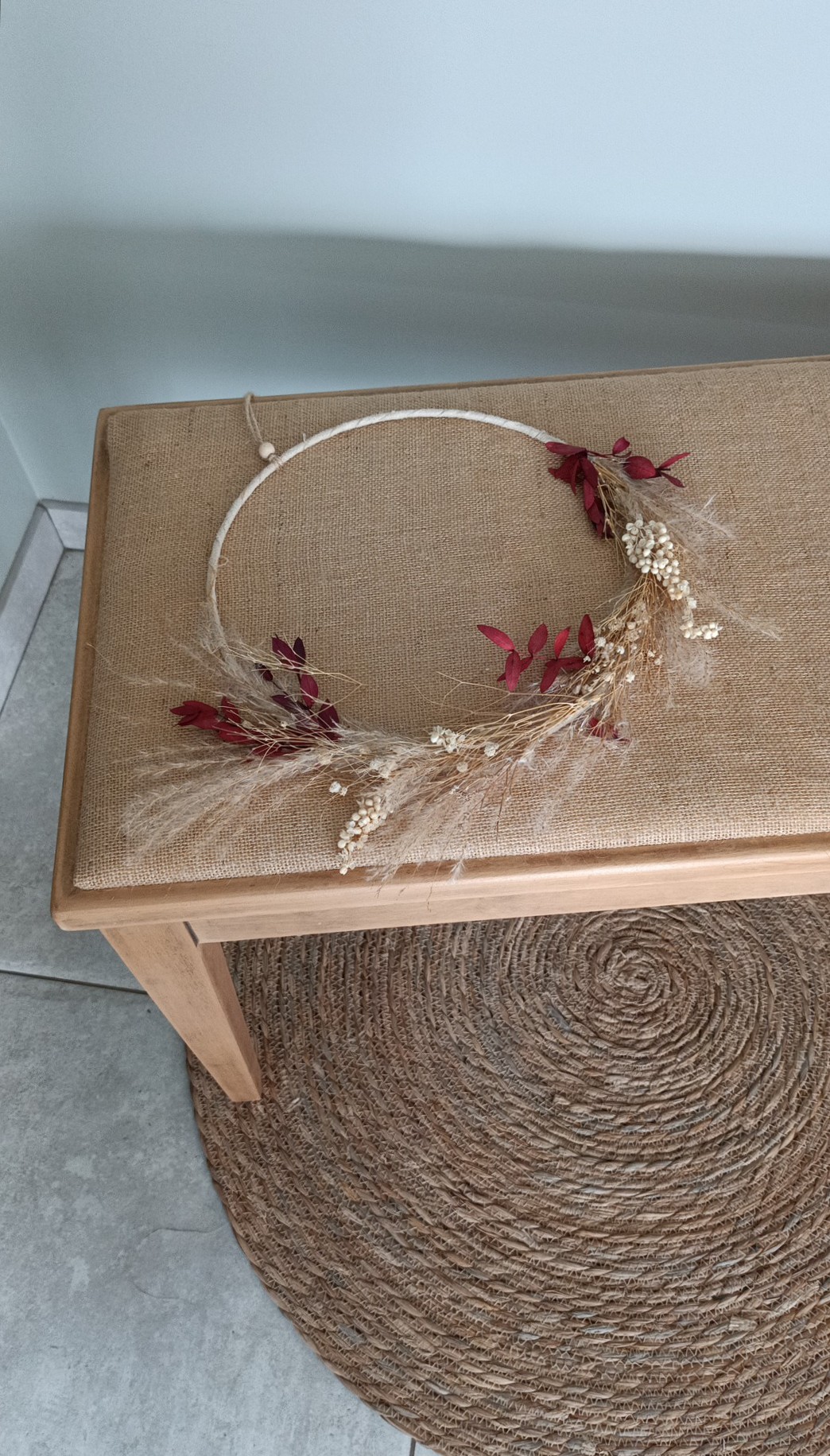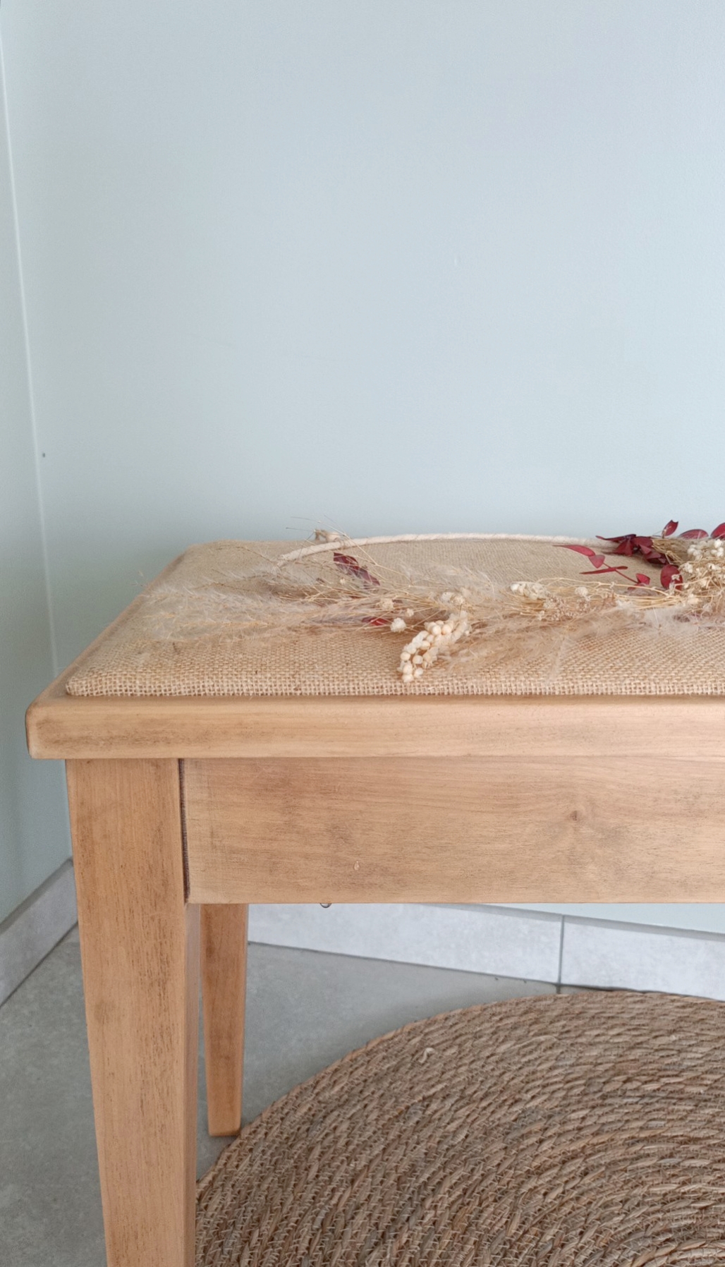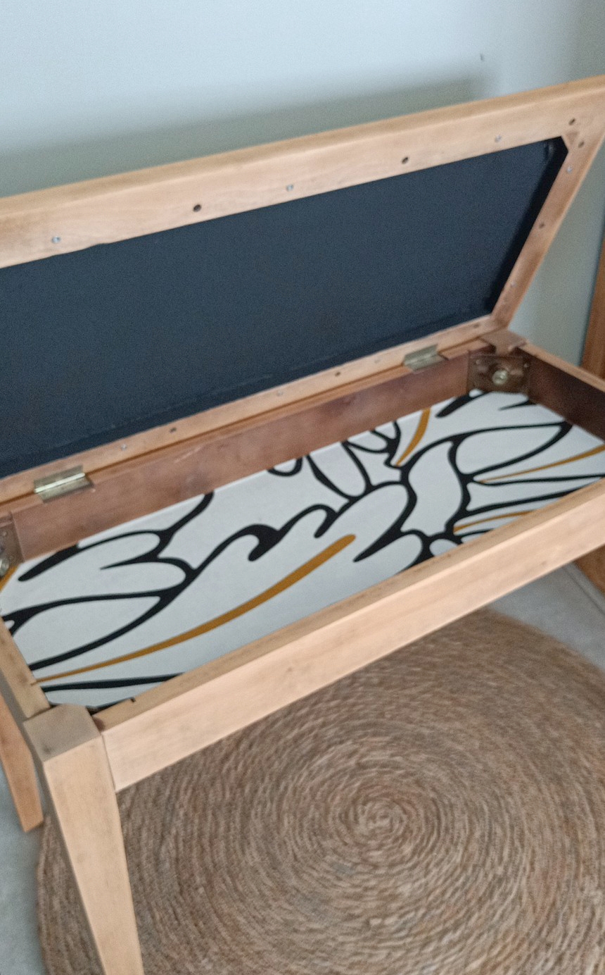 En bois massif, ce banc aux allures scandinave a été poncé, de la jute a remplacé l’ancien revêtement en cuir et son intérieur tapissé et peint en noir mat. Finition : vernis teinté chêne clair.