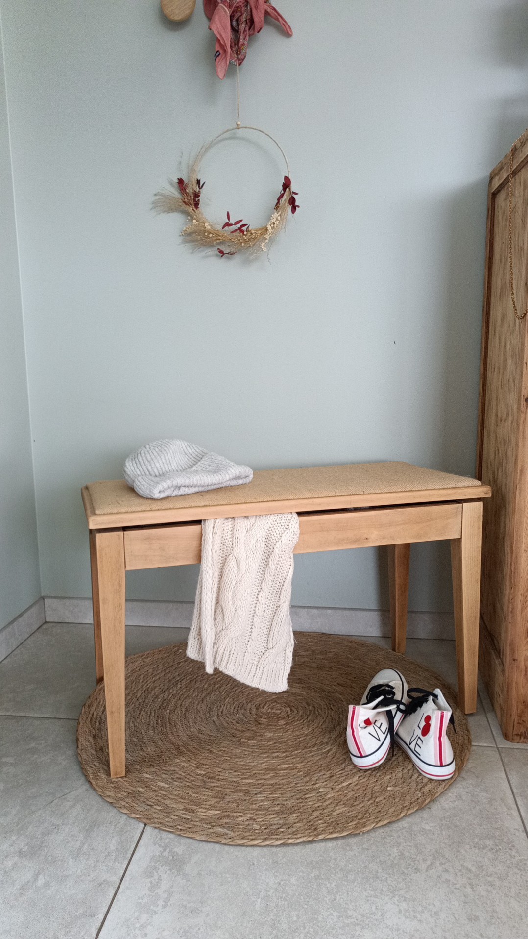 Petit banc ou banquette idéal dans une entrée car il cache un petit coffre pour y ranger écharpes gants et bonnets.