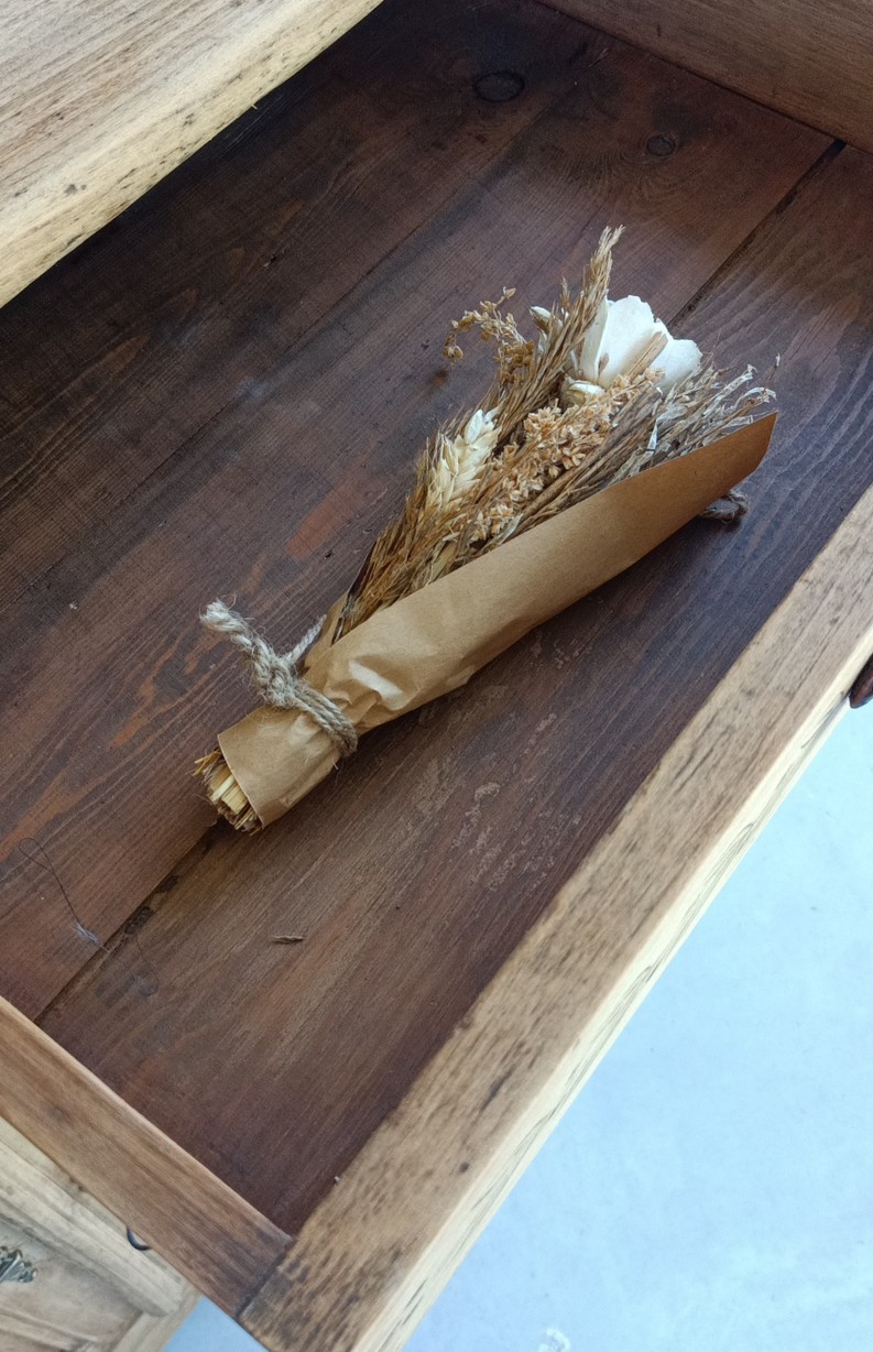 Meuble ancien qui comporte les traces de son ancienne vie, notamment une tache noire sur le plateau, ce qui participent à son charme