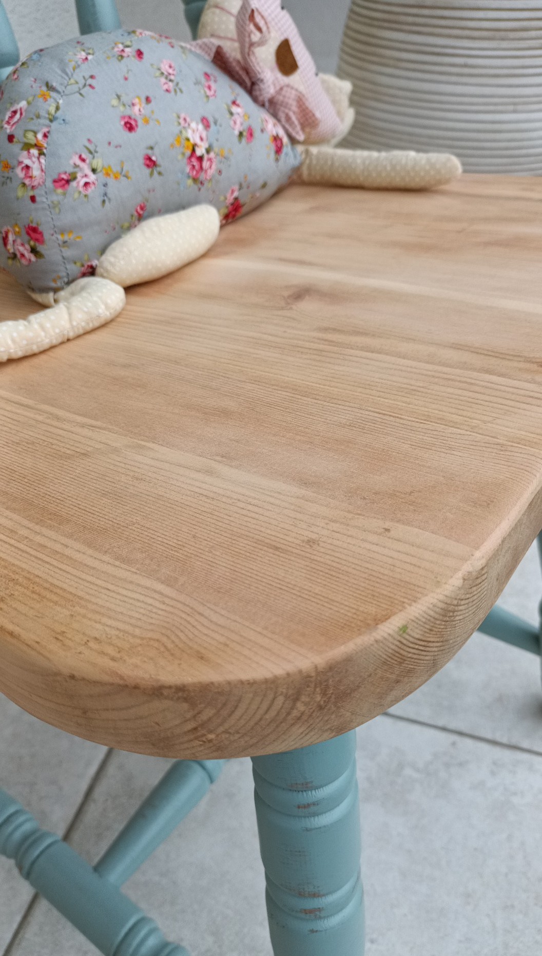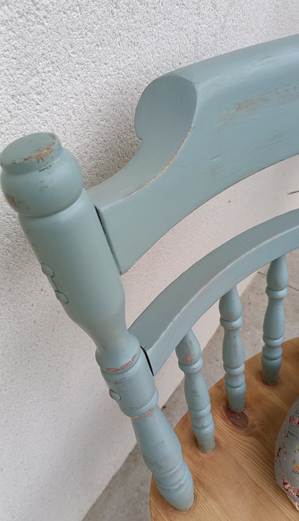 Plongez dans l’ambiance des saloons d’autrefois avec cette chaise western en pin, revisitée avec une patine effet vieilli peinte en vert céladon tirant sur le turquoise.