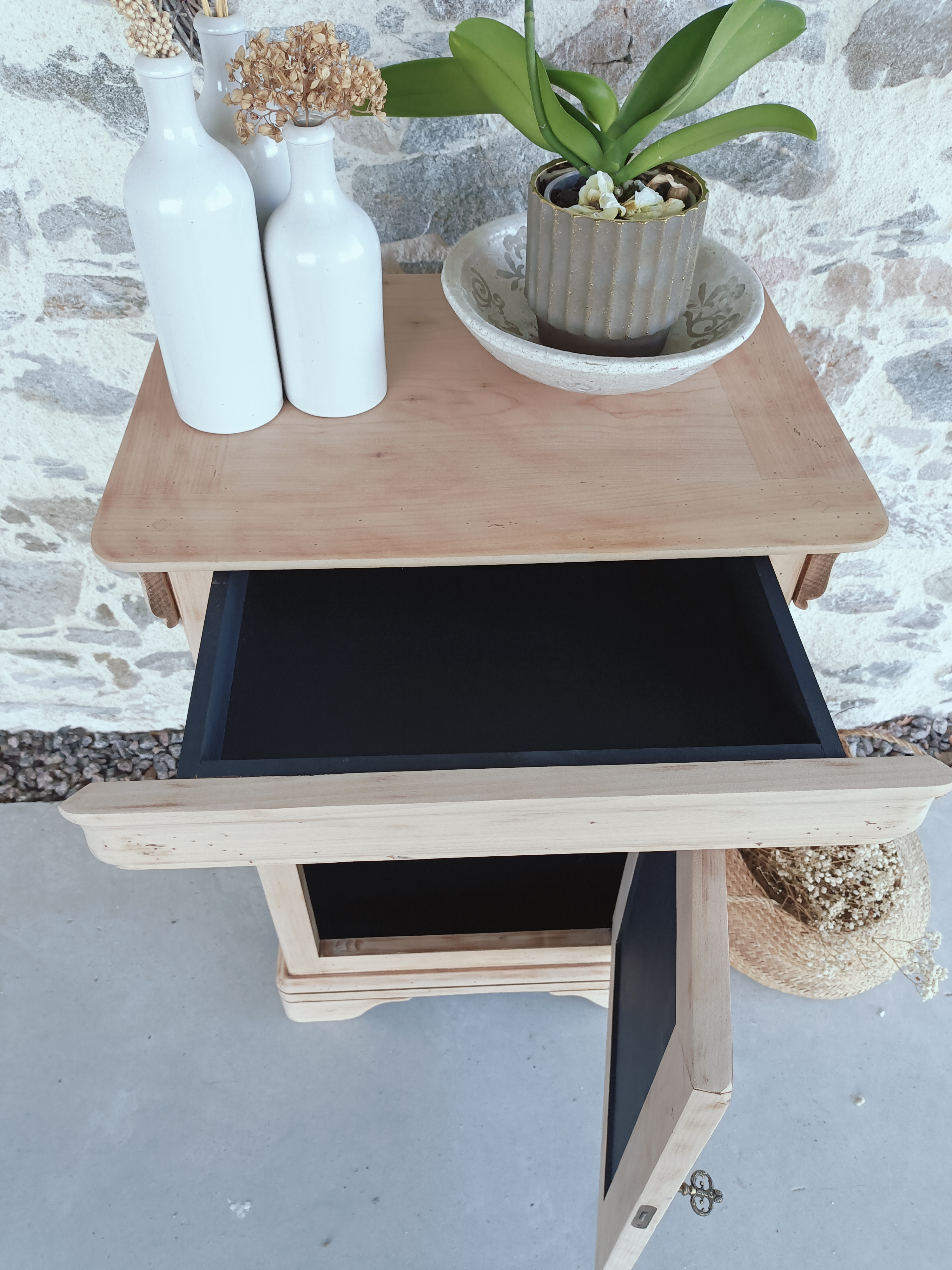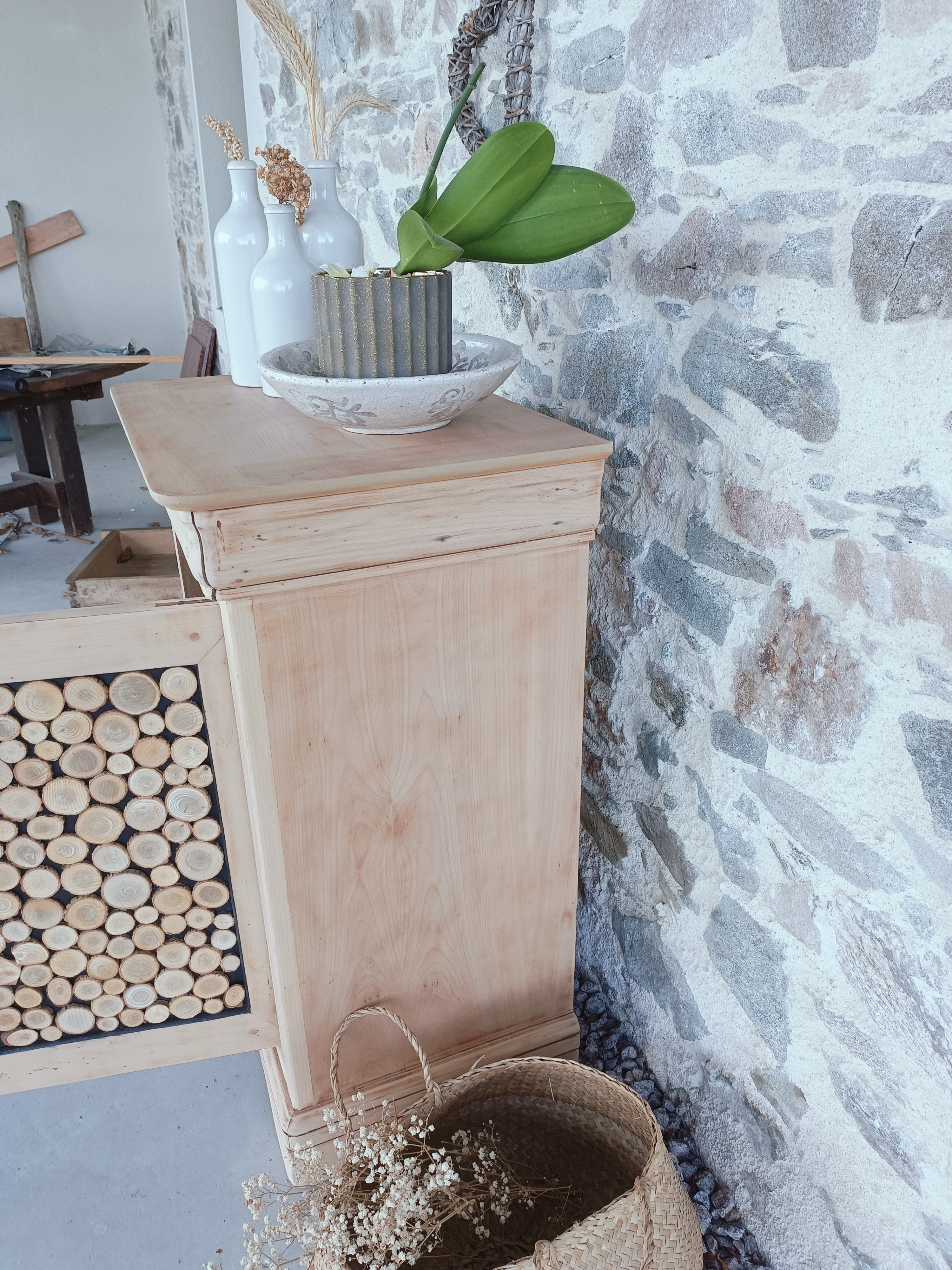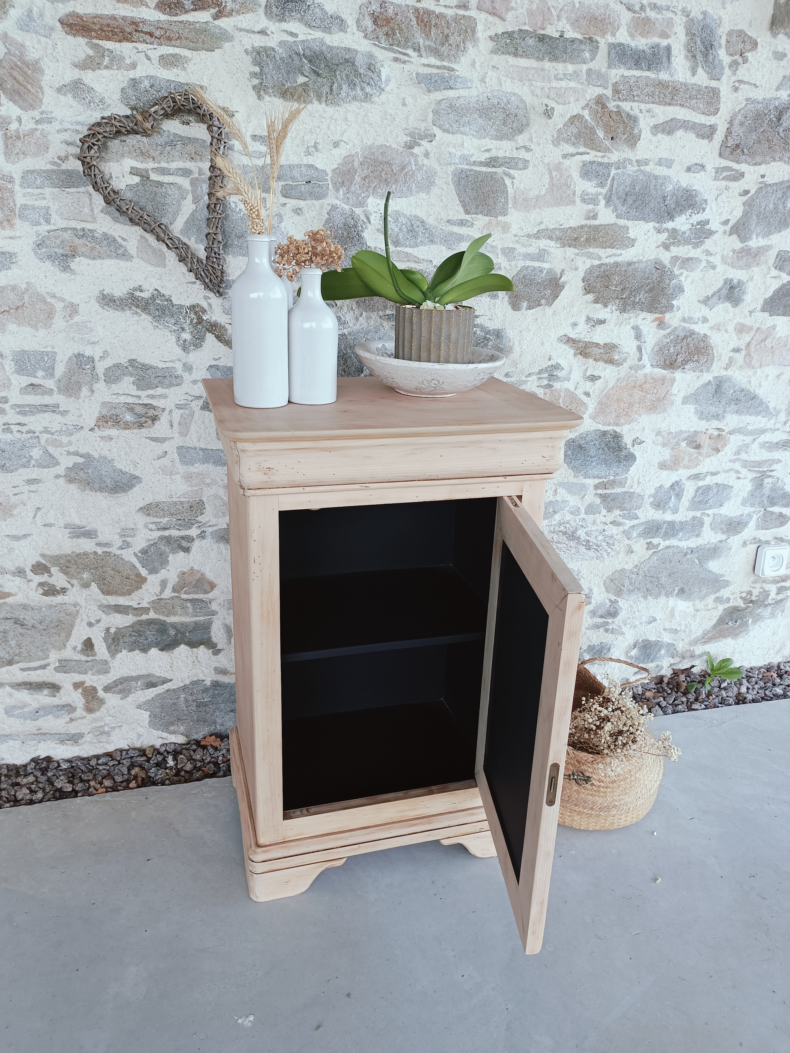 Il a été poncé, traité naturellement et vernis avec un vernis mat incolore, l’intérieur a été peint en noir ainsi que la façade avant sur laquelle est collé des petits tronçons de bois.